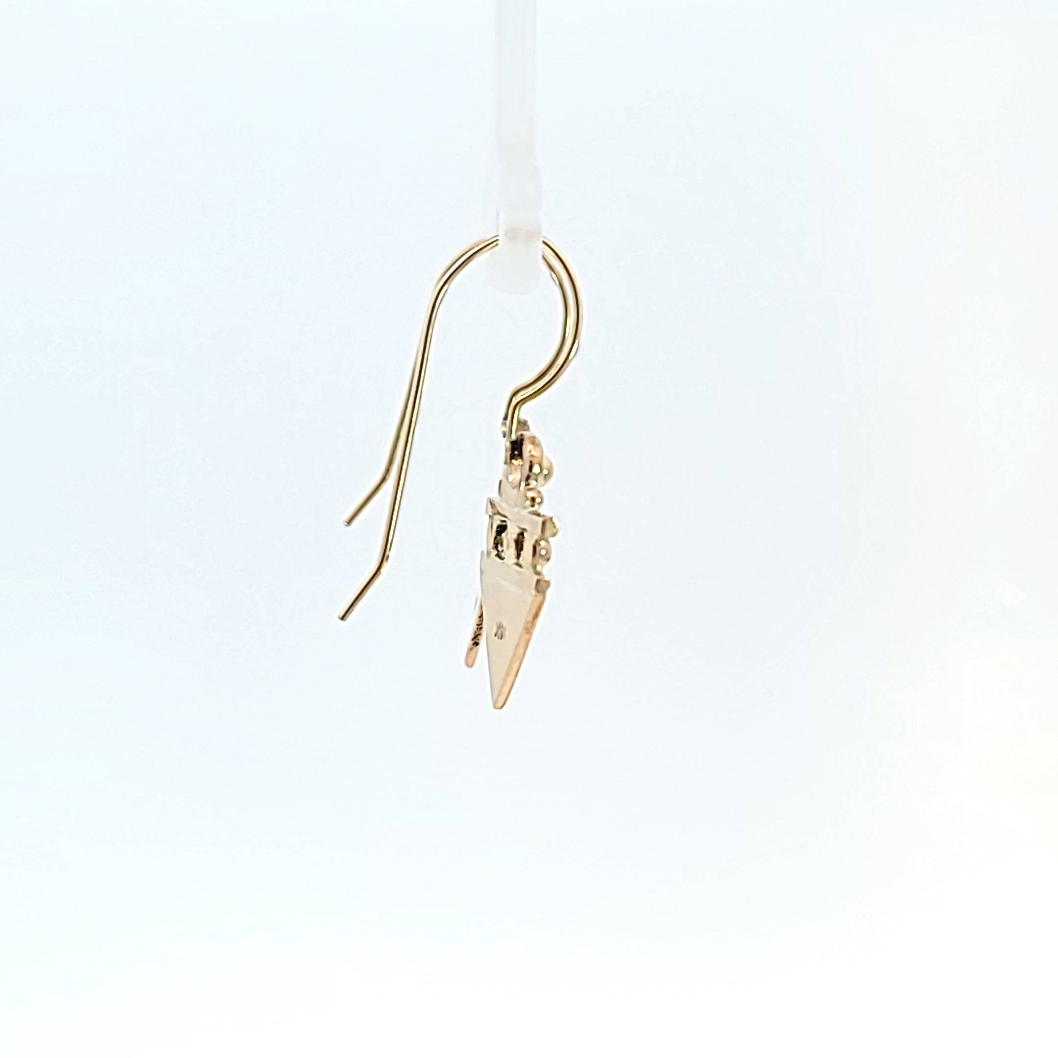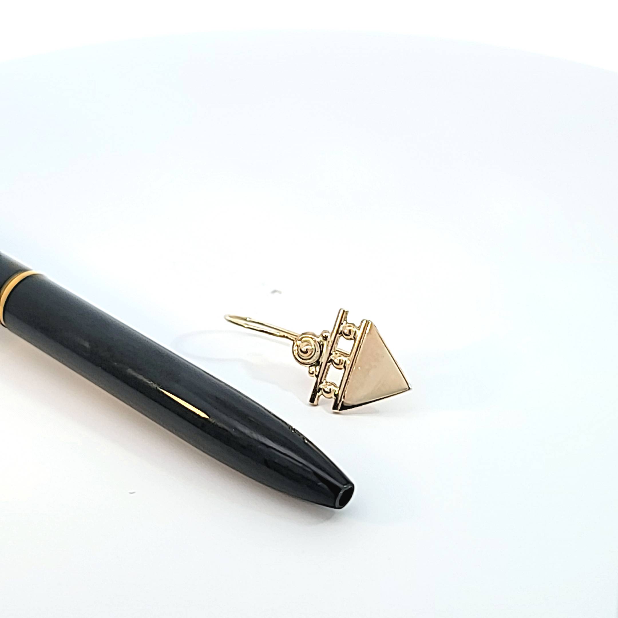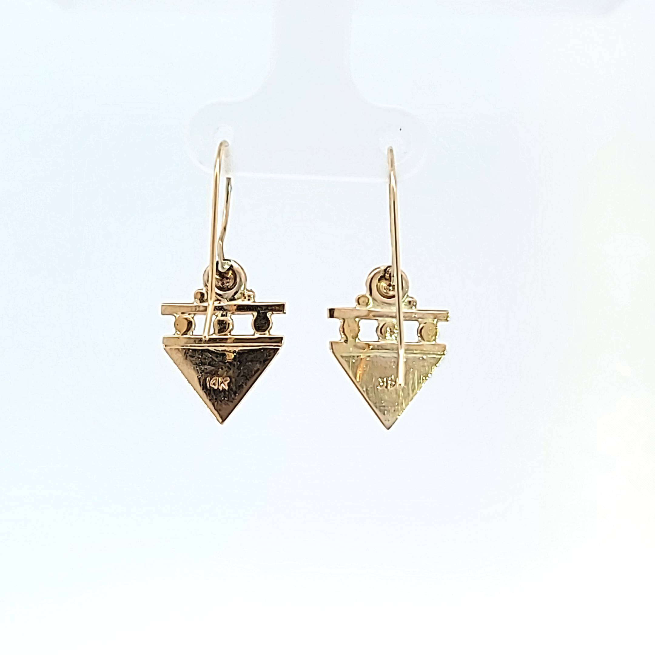 Handmade originally then cast to recreate, 14 kt yellow or white gold geometric triangle dangle earrings on a French wire. These beautiful earrings are dainty enough to be worn every day but a bold enough design to be noticed. The earrings are solid gold but only weigh just over 3 grams so as not to hang heavy on the ear. They measure approximately the size of a dime. A matching pendant is available and can be paired with earrings.