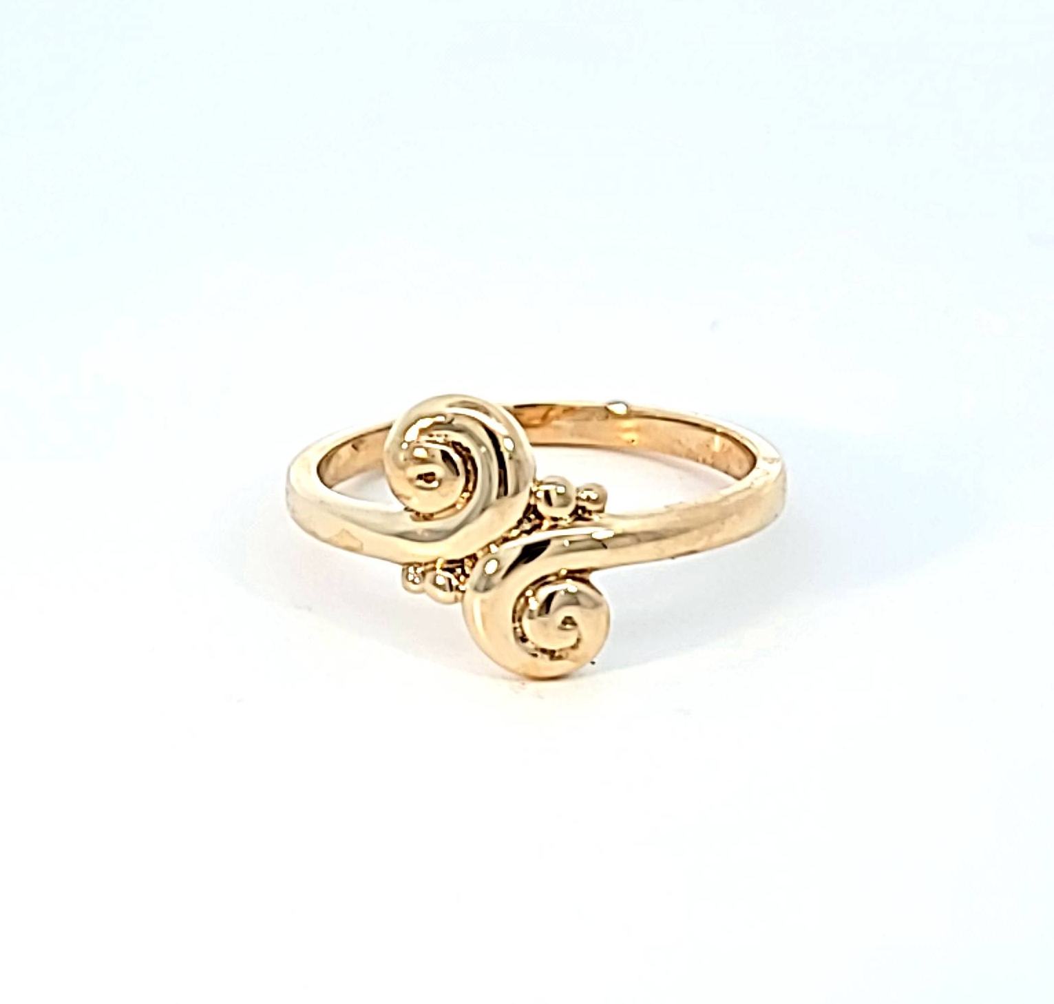 Unique custom-design 14 karat yellow or white gold ring, handmade design, and cast to recreate. This ornate yet simple gold design is an easy staple to wear every day. The perpendicular decorative top can bring attention to make fingers appear more elongated. An easy, light but solid piece that can match almost anything.
