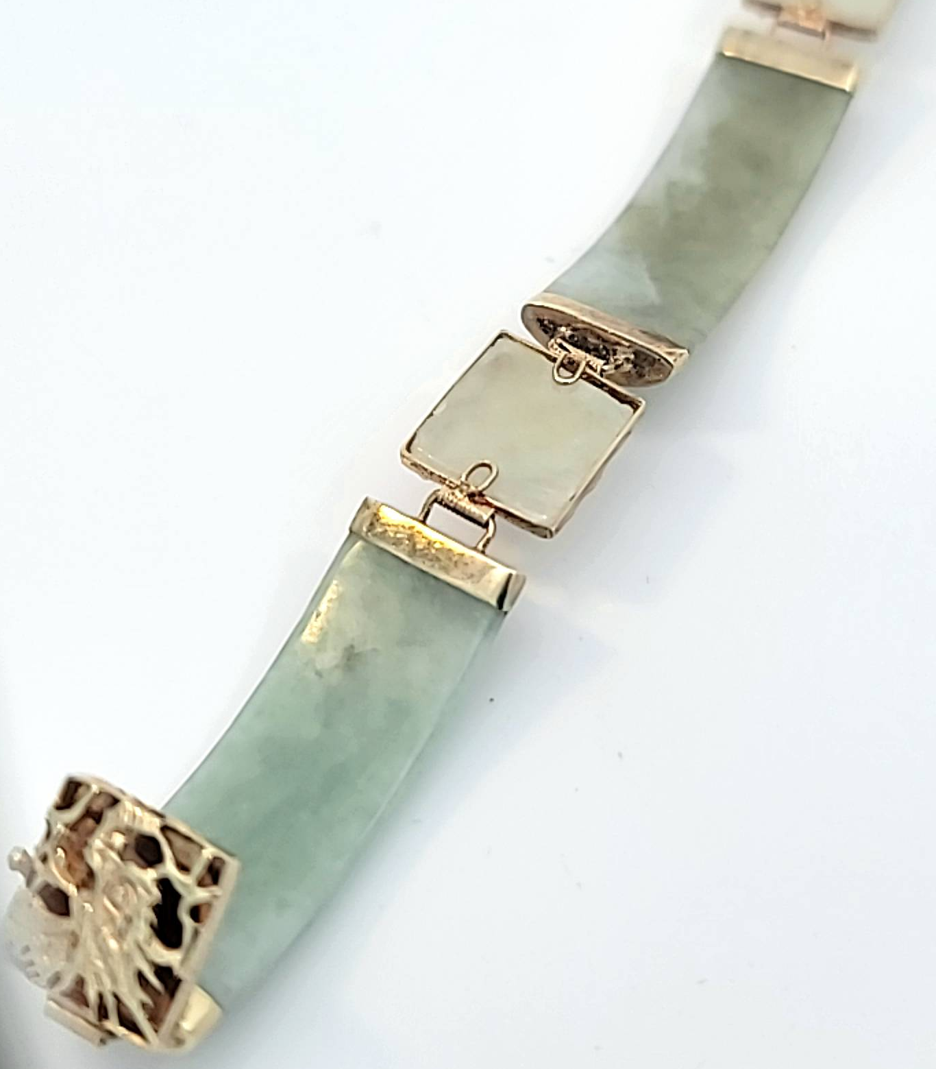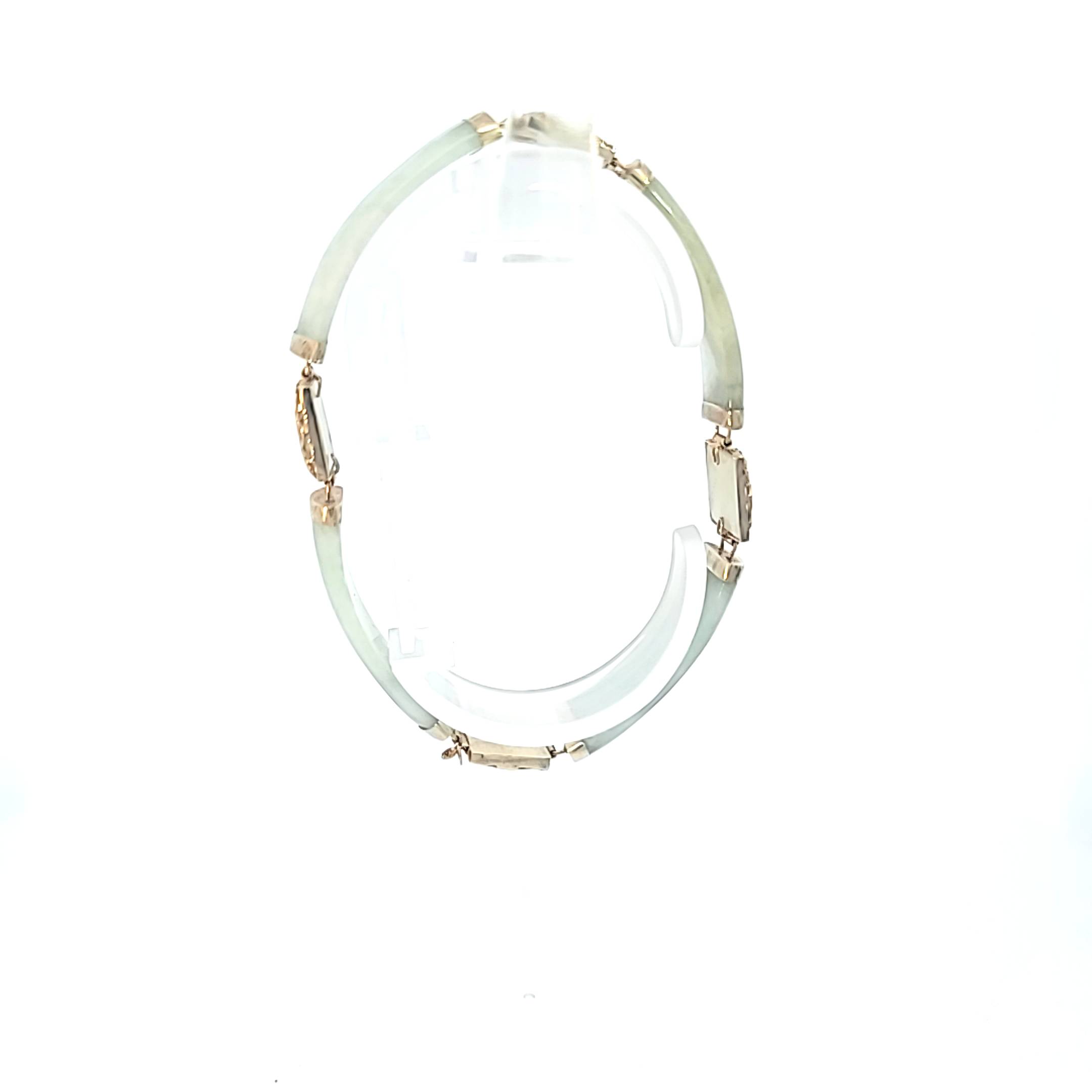 Oriental 14 karat yellow gold Jade link bracelet with dragon or Asian characters on each square link. This beautiful ornate vintage piece weighs over 14 grams and is approximately 10 mm width with a 7-inch length.
