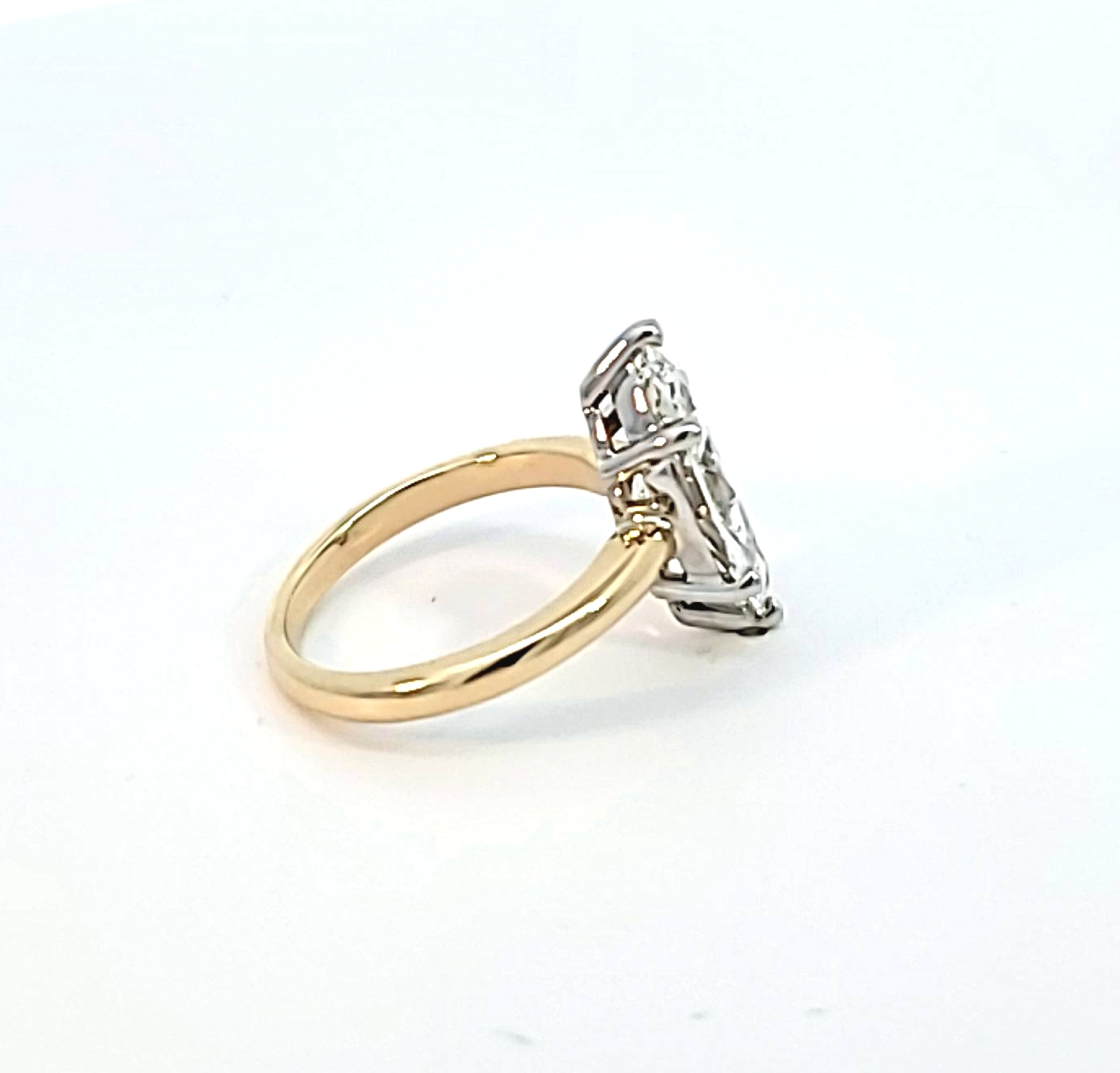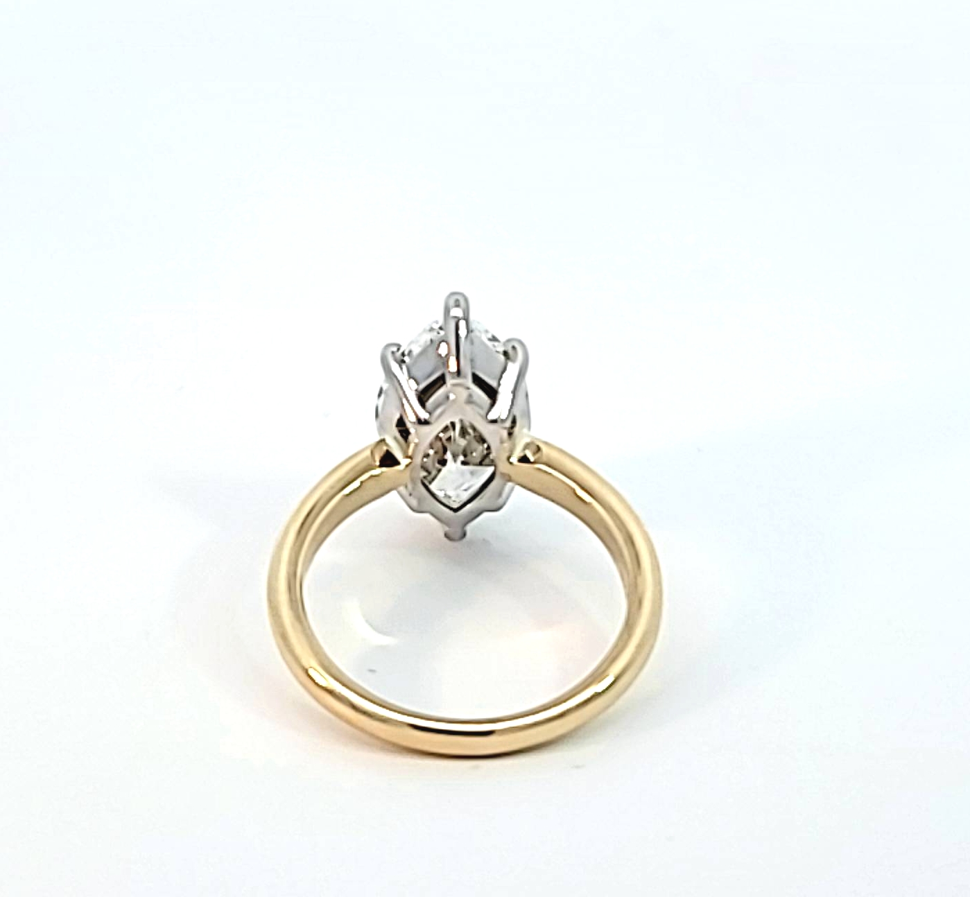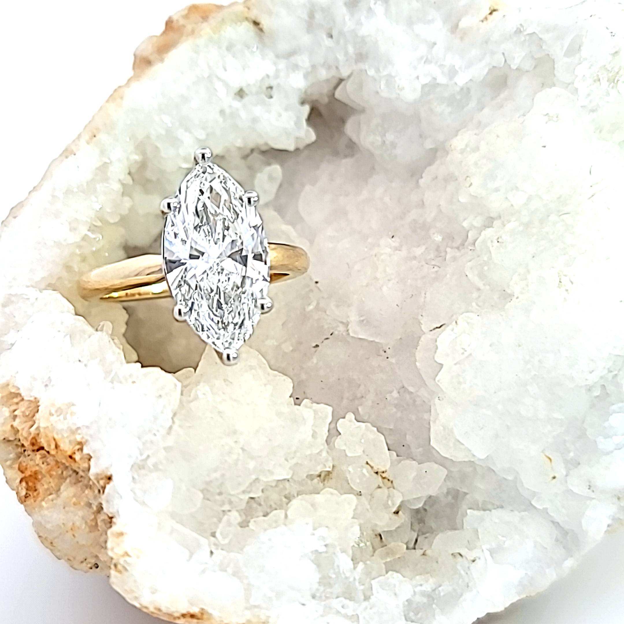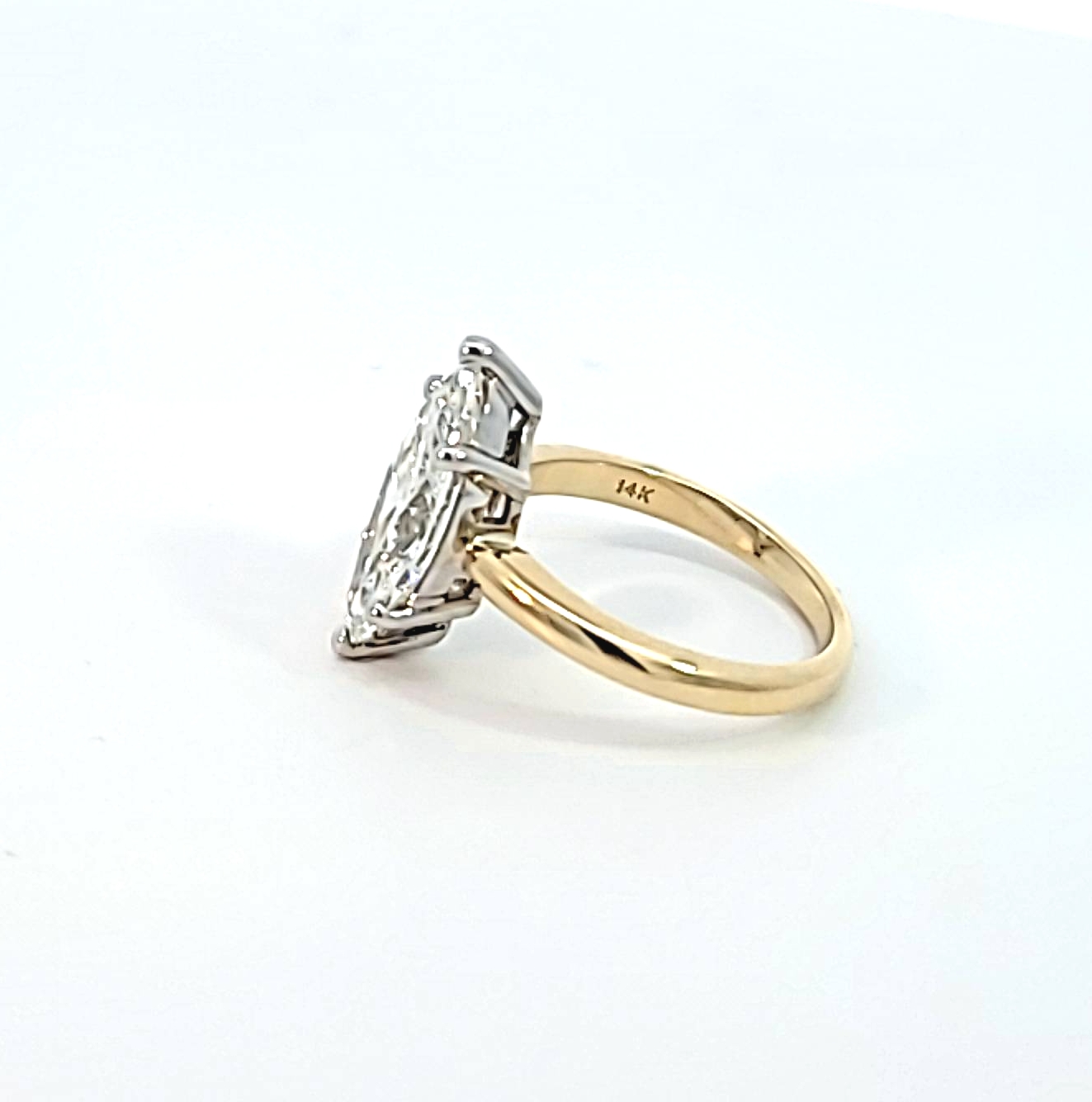 A marquise solitaire mounted in 14-karat yellow or white gold or platinum with an extremely low-profile diamond mount. The center diamond is an enormous Marquise 3.70 to 3.80 carat Lab Grown Diamond set in 6 white gold prongs to keep the pristine diamond color. Although this diamond is almost 4 carats in size, the low-profile mounting makes it an easy-to-wear ring; this is especially important for women with jobs that could cause high-mount rings to catch.