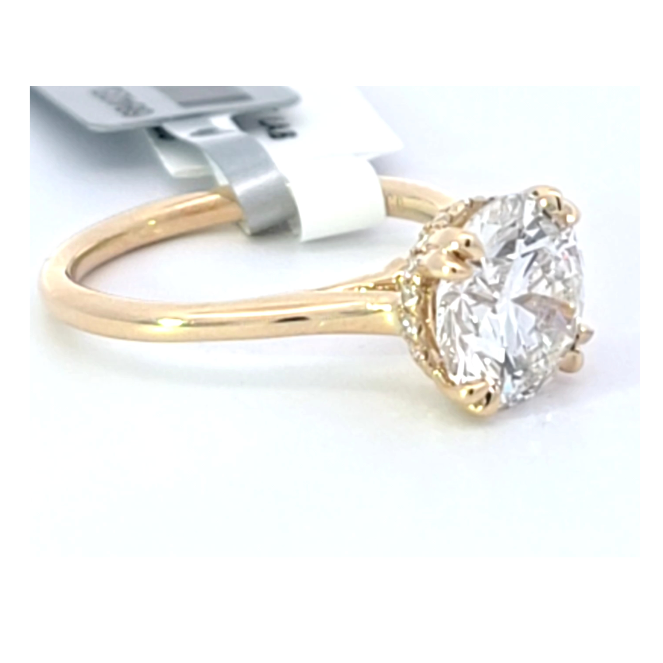 This exquisite solitaire diamond engagement ring makes a huge impact with a subtle hidden halo, while remaining a timeless classic.  A 14 karat yellow gold dainty mounting (available in white gold and platinum) with a Lab-grown round center diamond, minimum 3 carat. The stellar center diamond is paired with a .13 carat total weight hidden halo.  Color range in Lab-Grown diamonds will be between D-G, and Clarity will be at a minimum of SI1. (Pictured is a 3.05 carat center)